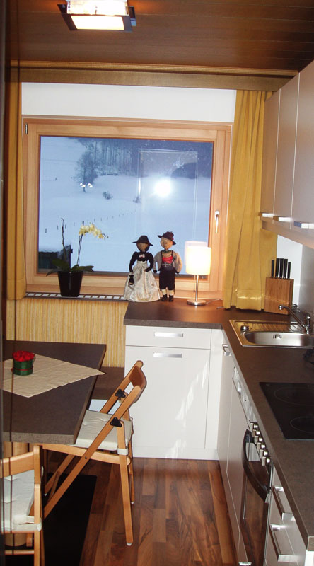 fully equipped kitchen with ceramic hob, baking oven, fume cupboard, microwave oven, refridgerator coffee machine, water kettle, toaster, plates, cutlery and dishtowels