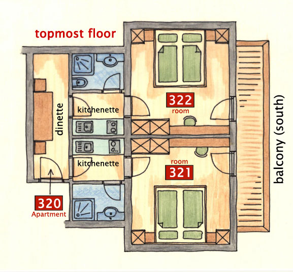 anteroom with wardrobe and dinette 2 double rooms shower / toilet 2 kitchenettes